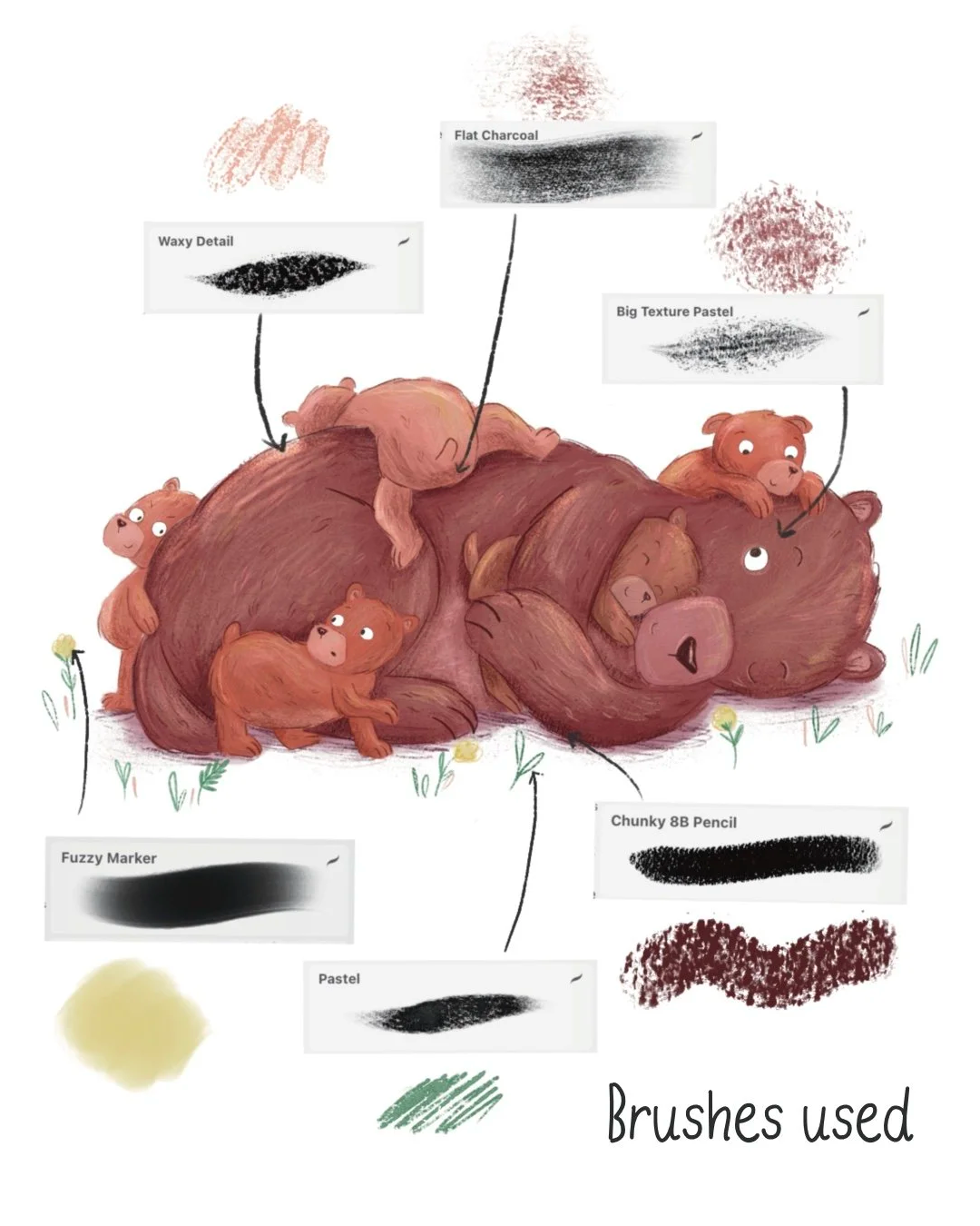 I used the Peppermint Texture brush during the baby bears section of this illustration for shading. Its great for building up shadow without it feeling heavy or overdone.